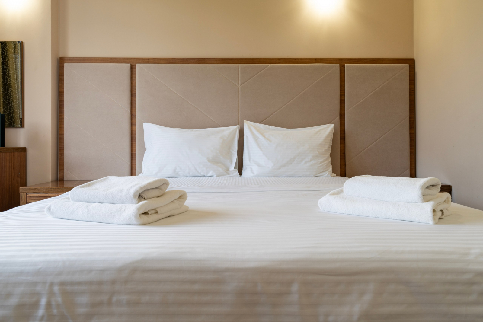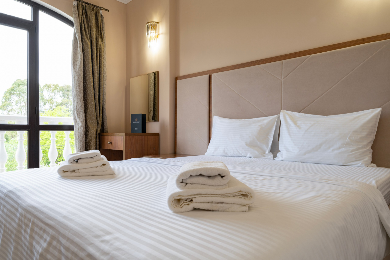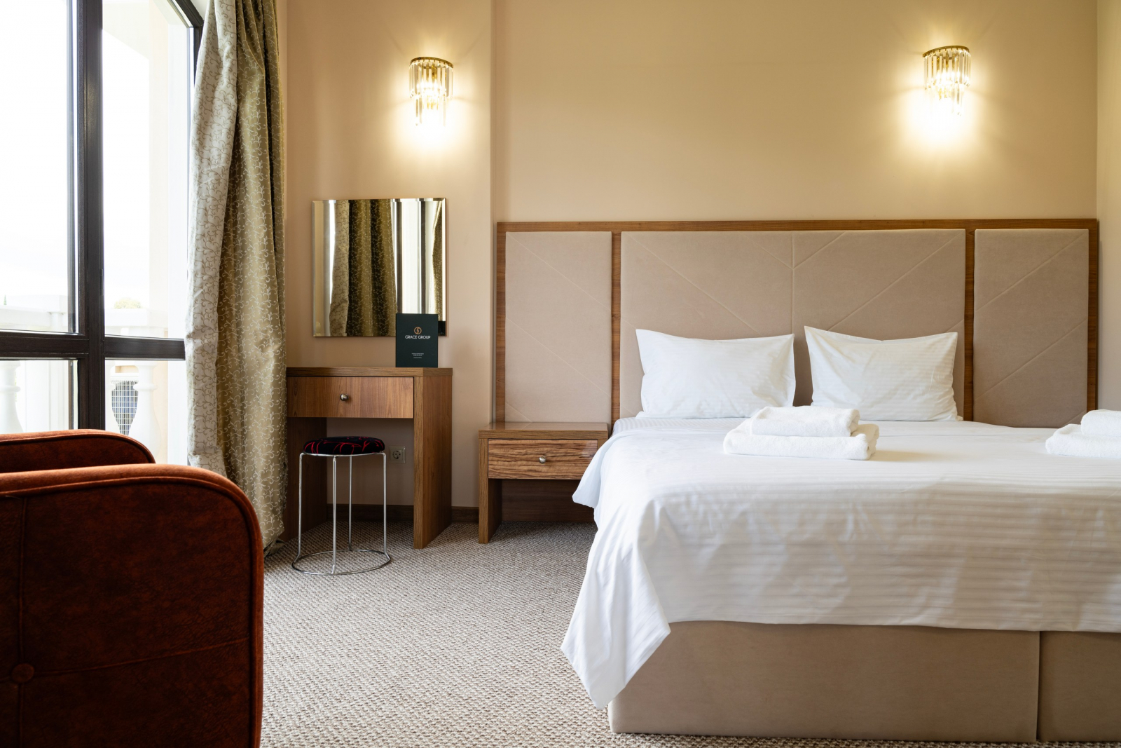 Площадь номера - 31 кв.м. 2 осн. места. Балкон. Мебель: вешалка, диван (2), зеркало, кресло, кровать двуспальная, прикроватные тумбочки, столик журнальный, столик туалетный, стулья, шкаф. Оборудование: сплит-система, телевизор, холодильник, чайный набор посуды, электрочайник. Санузел: с душем, туалетные принадлежности, фен. Сервис: Wi-Fi бесплатно, смена полотенец, смена постельного белья, уборка номера.